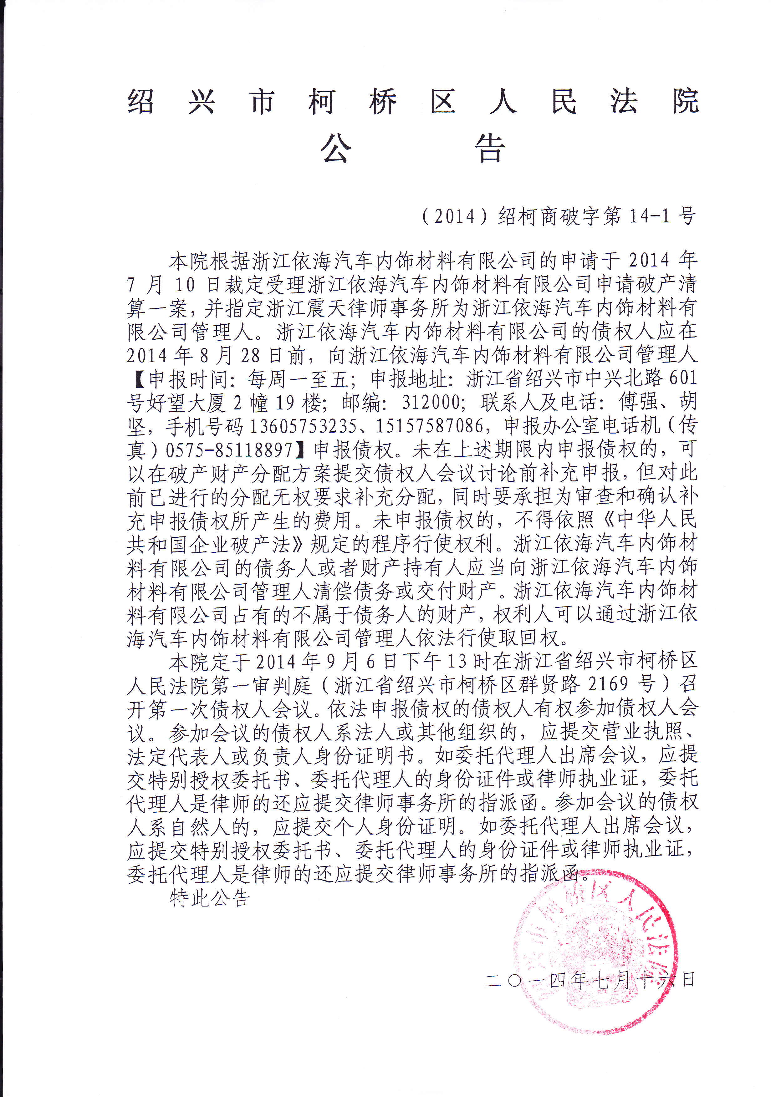 浙江依海汽车内饰材料有限公司债权申报资料